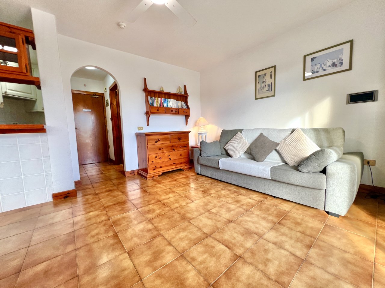 The apartment features an entrance hall, a family bathroom, a fully fitted kitchen, a bright double bedroom with fitted wardrobes, and a lounge/dining area that opens onto a sunny terrace, perfect for enjoying the morning sun.
