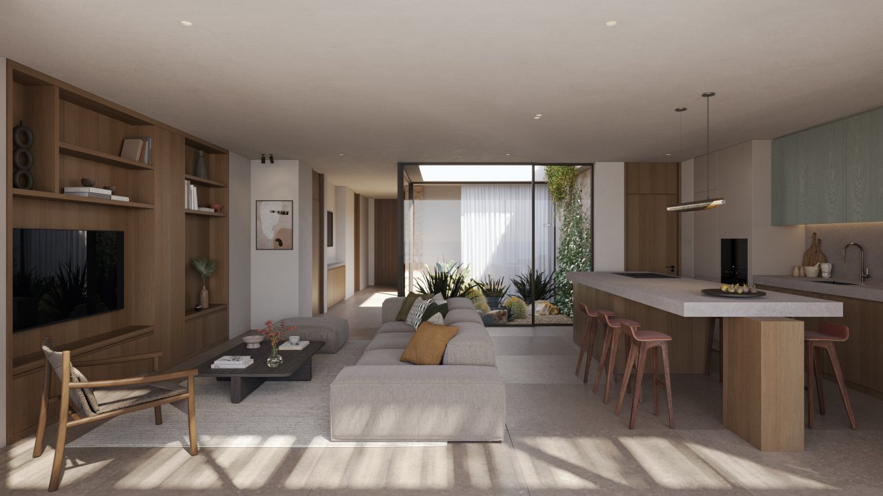 Each villa offers three spacious bedrooms with en-suite bathrooms plus a guest WC, designed for both privacy and comfort. The homes feature a private swimming pool, generous terraces, an interior courtyard, and landscaped gardens that create seamless indoor-outdoor living. Additional benefits include a private parking space, storage room.